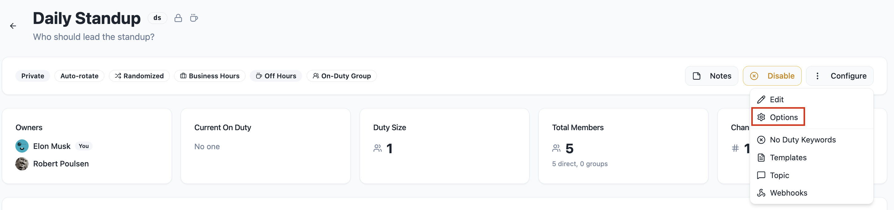 If the rotation is off-business, instead, the Next on Duty block will show you the following users who will go online once the off time is over, usually the same users as before, together with the time the shift will restart.