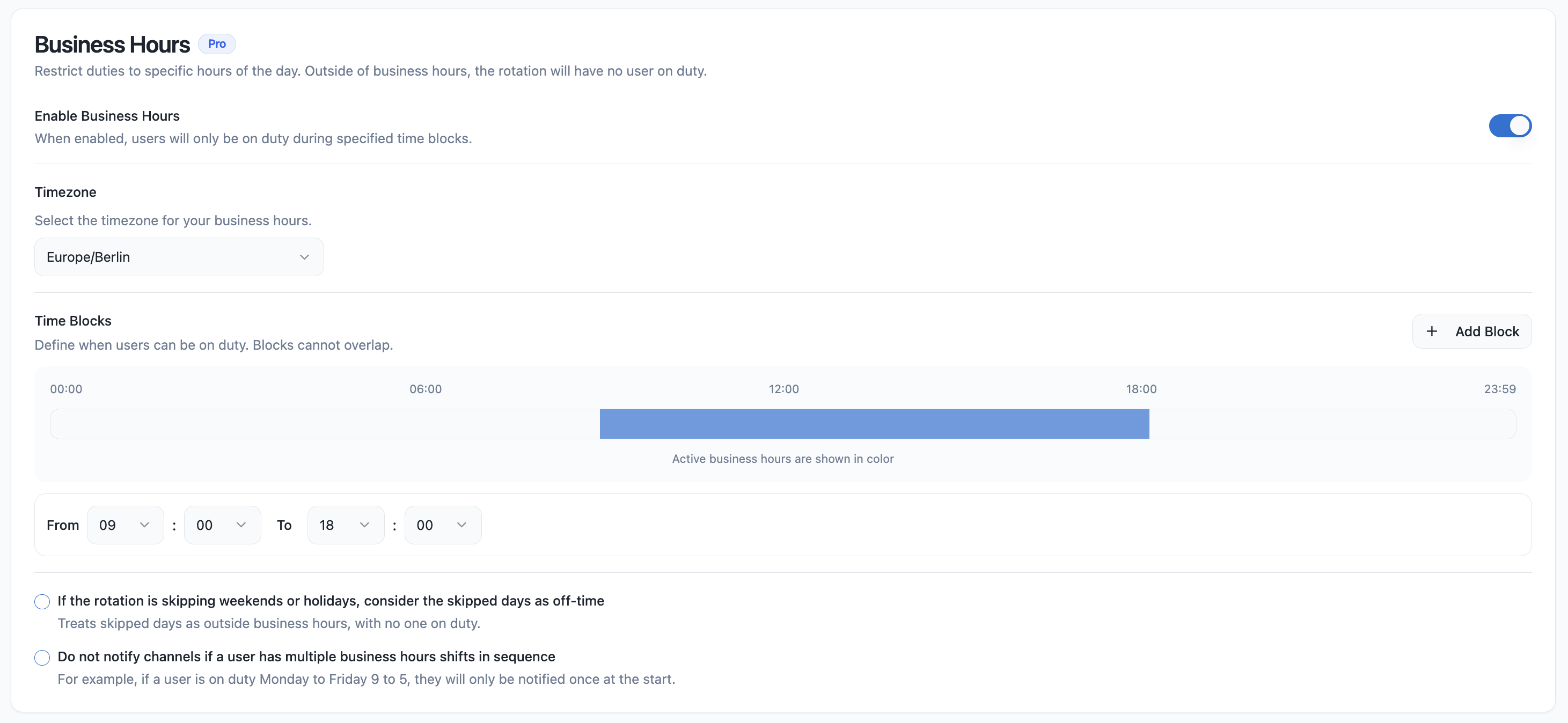 In business-hour mode, the user(s) on duty will go on or off duty based on the business-hour slots assigned to the rotation, without necessarily switching duty with the next on-duty in the rotation plan.