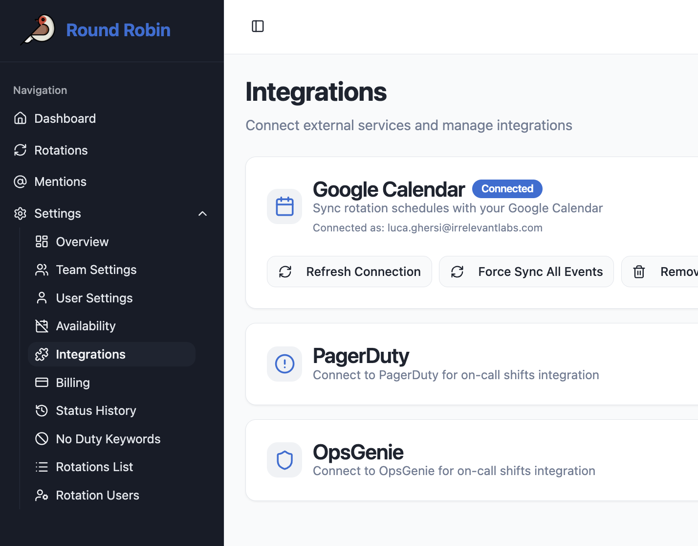 Open the Round Robin Dashboard, then go to Settings > Integrations in the left menu.