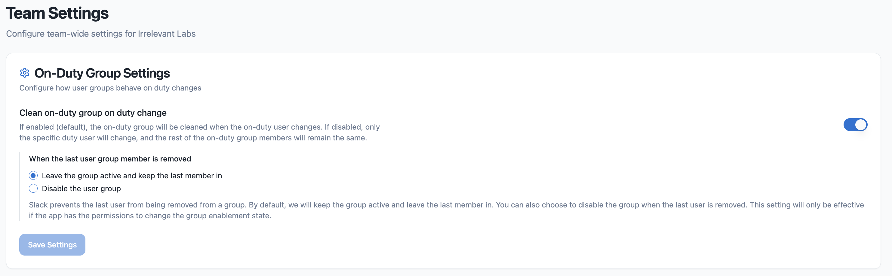 Another crucial point is that a Slack user group requires at least one member. This is Slack stuff, and you cannot control it. If, for any reason, the last member of an on-duty group needs to go off-duty (for example, if you're using business hours rotations), then you can decide how the system should behave using the second option.